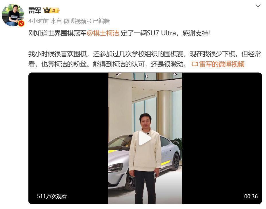 在得知柯洁定购了小米su7ultra后,雷军发文表示:刚知道世界围棋冠军@棋士柯洁 定了一辆SU7 Ultra,感谢支持!我小时候很喜欢围棋,还参加过几次学校组织的围棋赛,现在我很少下棋,但经常看,也算柯洁的粉丝。能得到柯洁的认可,还是很激动。